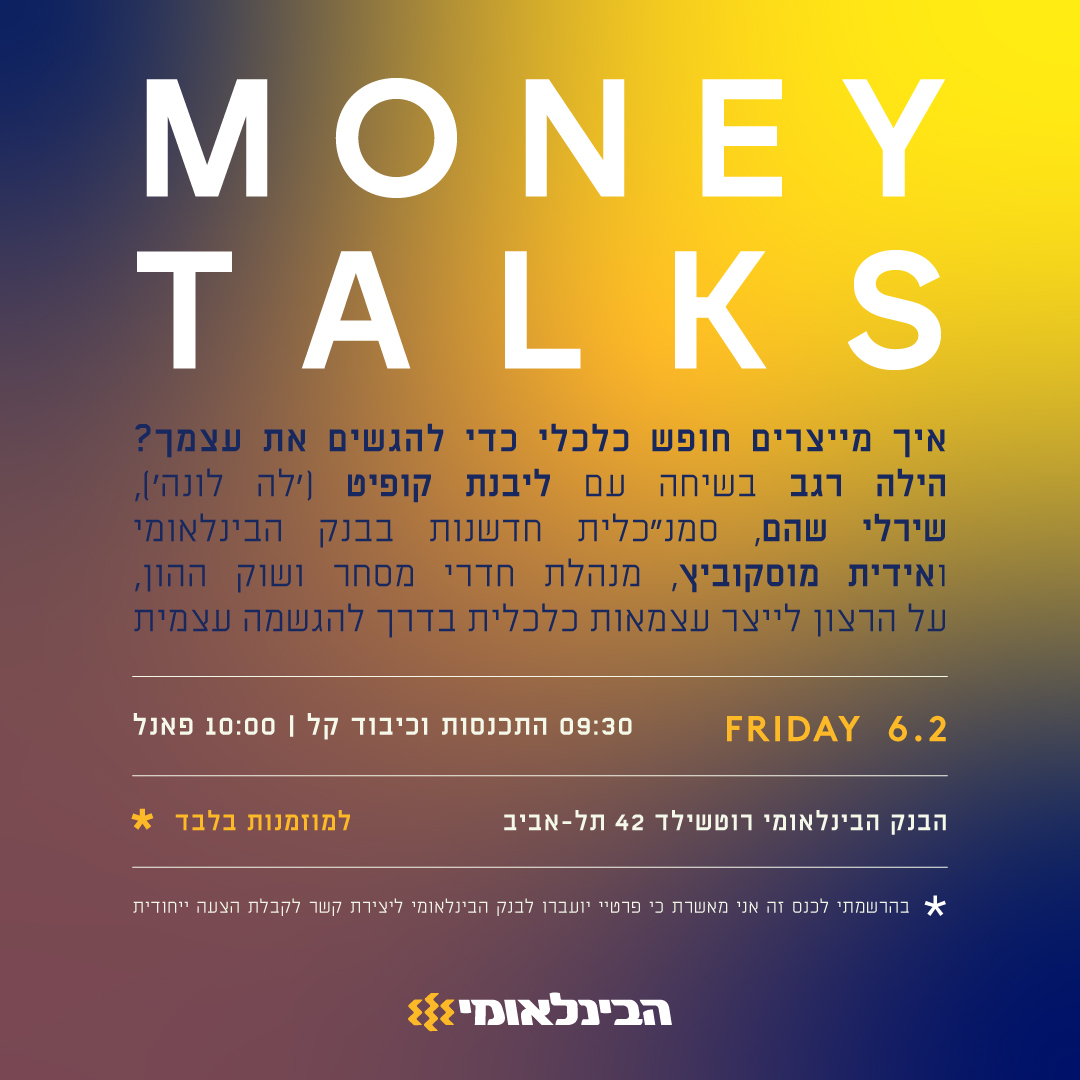 09:30 התכנסות 10:00 פאנל איך מייצרים חופש כלכלי כדי להגשים את עצמך? הילה רגב בשיחה עם ליבנת קופיט ('לה לונה'), שירלי שוהם, סמנכ"לית חדשנות בבנק הבינלאומי ועידית פוגל, מנהלת מחלקת הפרסום והשיווק הקבוצתי, הבנק הבינלאומי על הרצון לייצר עצמאות כלכלית בדרך להגשמה עצמית *בהרשמתי לכנס זה אני מאשרת כי פרטיי יועברו לבנק הבינלאומי ליצירת קשר